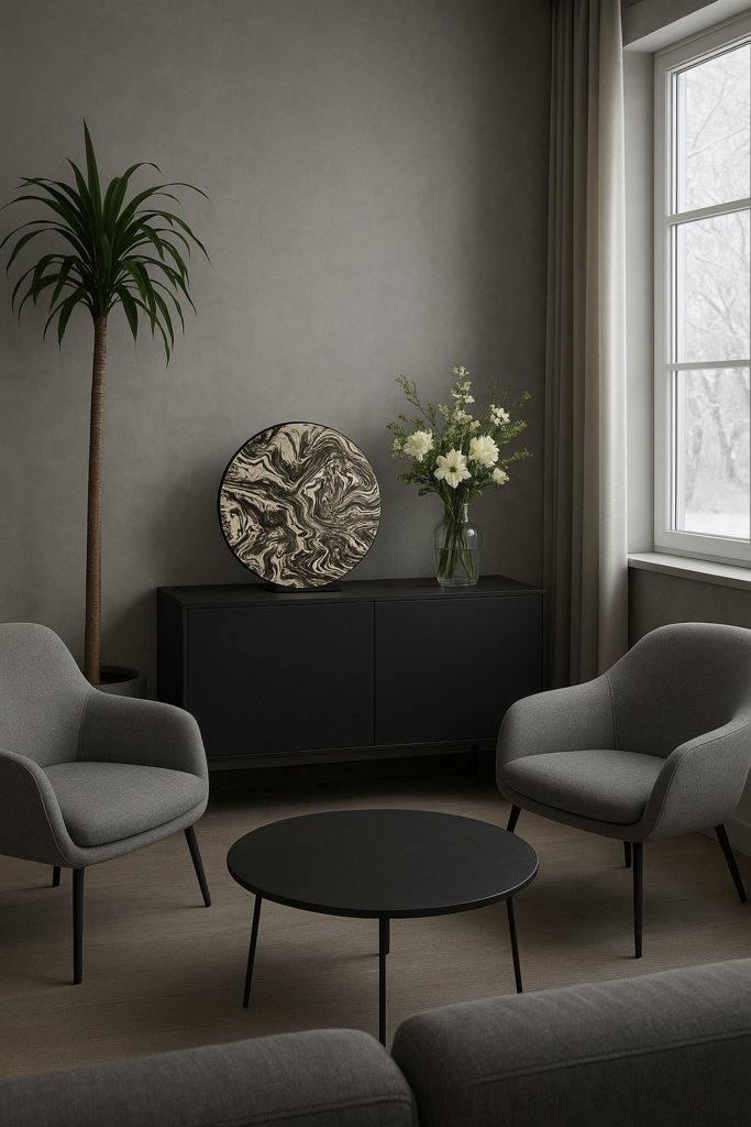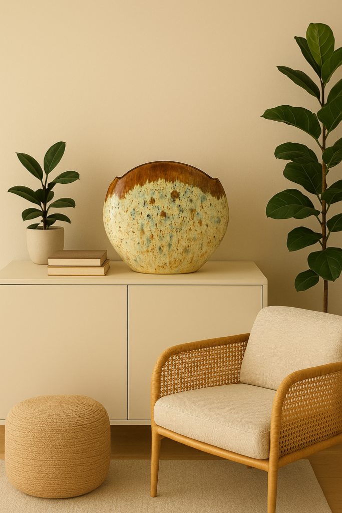 Kiedy wybieramy wazon utrzymany w podobnej kolorystyce do otoczenia, np. w tonacji ścian czy mebli, uzyskujemy efekt spójności i płynności wizualnej. Wnętrze staje się spokojne, eleganckie, zrównoważone – wazon stapia się z tłem, tworząc wrażenie pełnej harmonii. To rozwiązanie idealne do przestrzeni minimalistycznych, gdzie kluczowe znaczenie ma wyważenie form i subtelność detalu.