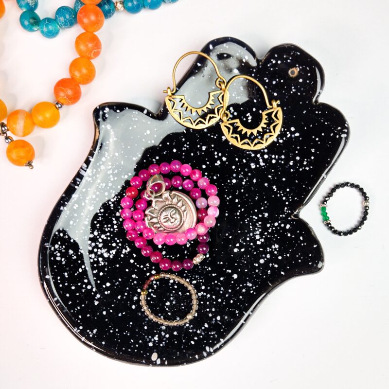 Talerzyk w kształcie rączki Fatimy. Symbolicznie ma ona chronić przed złymi wpływami. W moim wykonaniu jest również praktyczna 😉 dedykowana dla palo santo, białej szałwi jak i tradycyjnych kadzideł. Sprawdzi się również jako talerzyk na drobiazgi jak biżuteria, klucze, drobniaki itp. Zachowaj czujność, kolejne nowości w drodze 😉 Rozmiar: 10cm x 8cm Posiada otwór do…